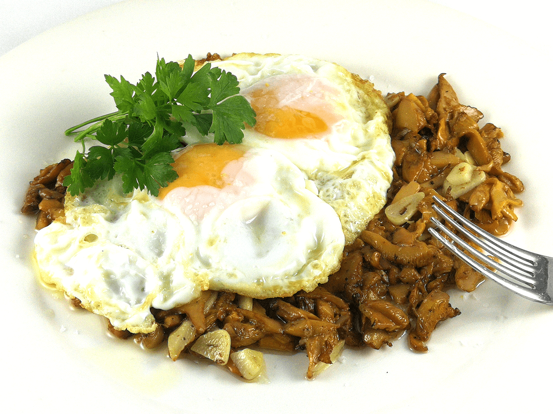 Los rebozuelos son unos de los grandes reyes de las setas y de la cocina de temporada. La sensibilidad del cocinero al saltearlos con aceite de oliva y ajo, cuidando el punto exacto de clara y de yema al freír los huevos que se le añaden encima, es lo que transforma este plato en una delicia.